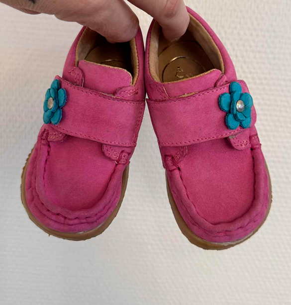 Aurelka mokkasiner med velcro i pink nubuck skind med fin turkisblå blomst. Aurelkas sko er lavet i samarbejde med professionelle, ortopædiske læger og fysioterapeuter for ekstraordinær god støtte til børn med særlige støttebehov.