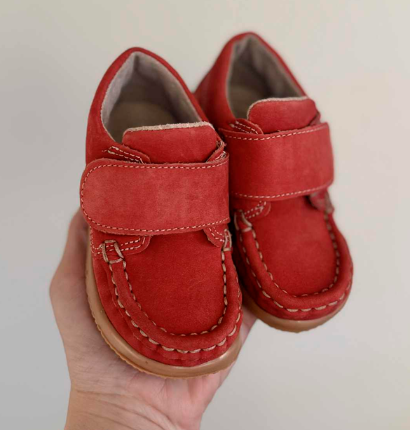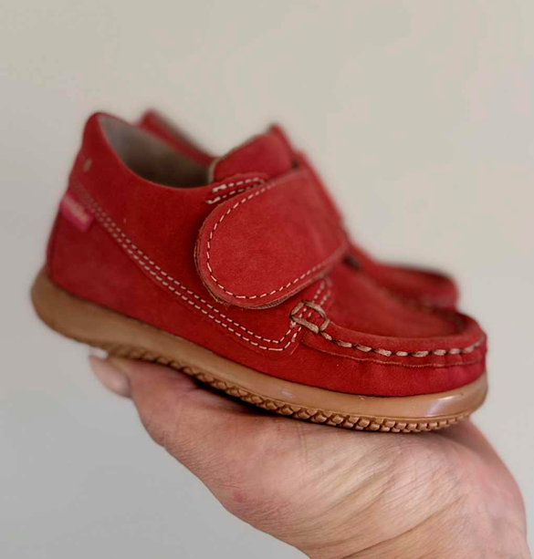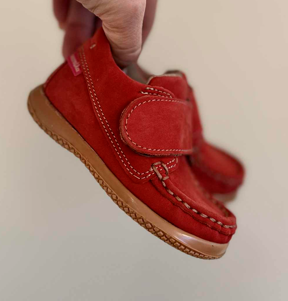 Aurelka mokkasiner med velcro i rød nubuck skind. Aurelkas sko er lavet i samarbejde med professionelle, ortopædiske læger og fysioterapeuter for ekstraordinær god støtte til børn med særlige støttebehov.