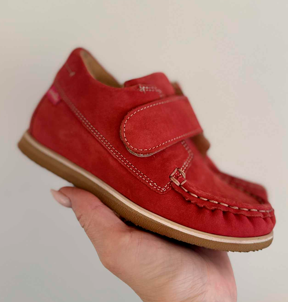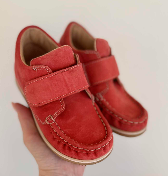 Aurelka mokkasiner med velcro i rød nubuck skind. Aurelkas sko er lavet i samarbejde med professionelle, ortopædiske læger og fysioterapeuter for ekstraordinær god støtte til børn med særlige støttebehov.