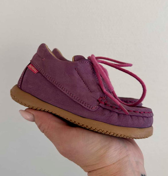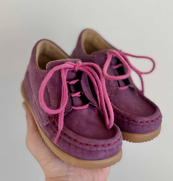 Aurelka mokkasiner med snørebånd i lilla nubuck skind. Aurelkas sko er lavet i samarbejde med professionelle, ortopædiske læger og fysioterapeuter for ekstraordinær god støtte til børn med særlige støttebehov.