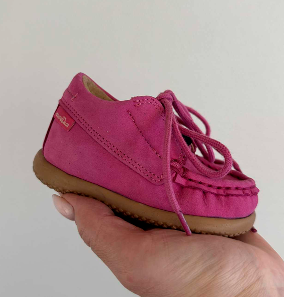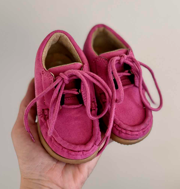 Aurelka mokkasiner med snørebånd i pink nubuck skind. Aurelkas sko er lavet i samarbejde med professionelle, ortopædiske læger og fysioterapeuter for ekstraordinær god støtte til børn med særlige støttebehov.