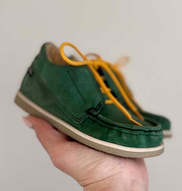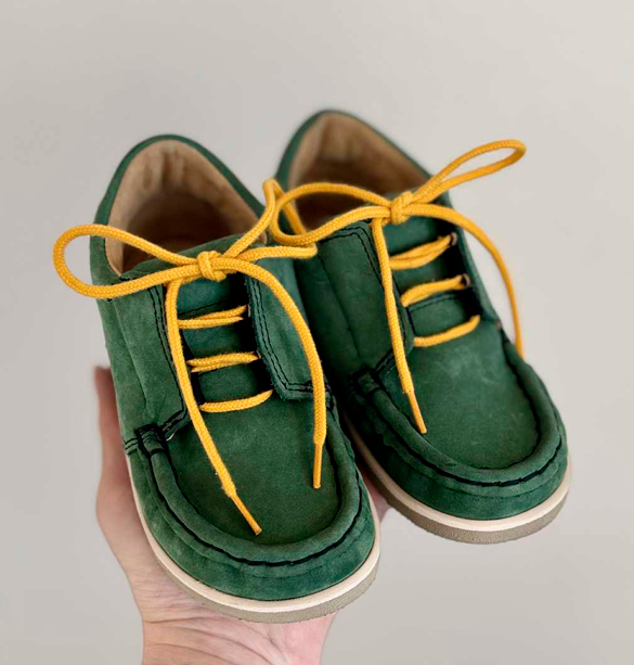 Aurelka mokkasiner med snørebånd i grøn nubuck skind. Aurelkas sko er lavet i samarbejde med professionelle, ortopædiske læger og fysioterapeuter for ekstraordinær god støtte til børn med særlige støttebehov.
