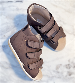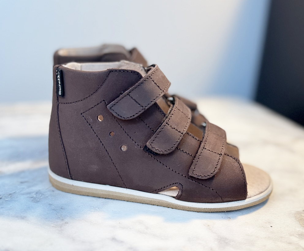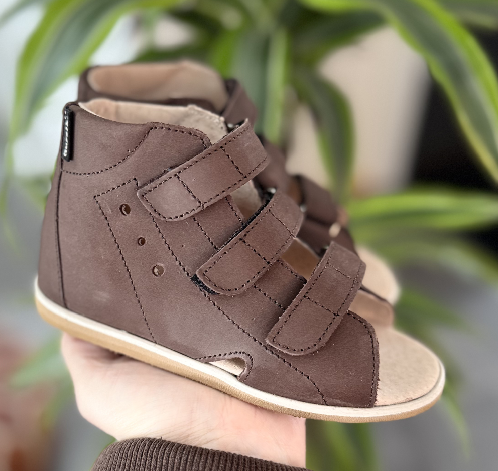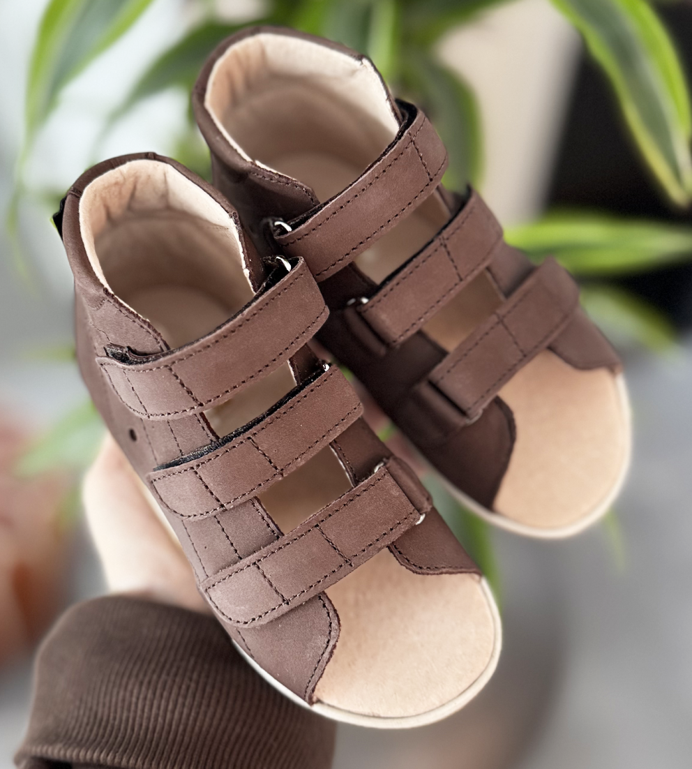 Lækre Aurelka sandaler i brun nubuck skind. Aurelkas sko er lavet i samarbejde med professionelle, ortopædiske læger og fysioterapeuter for ekstraordinær god støtte til børn med særlige støttebehov.