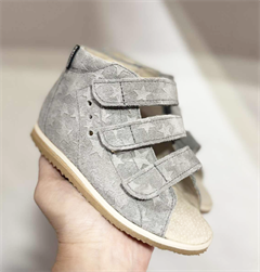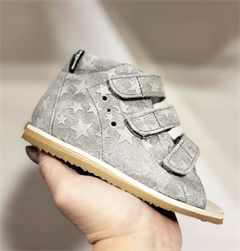 Aurelka sandal i lækkert lysegråt skind med stjerne præget - vær obs på at dette skind er lidt mere blødt end de fleste andre fra Aurelka. Det betyder at sandalen er meget behagelig. Aurelkas sko er lavet i samarbejde med professionelle, ortopædiske læger og fysioterapeuter for ekstraordinær god støtte til børn med særlige støttebehov.