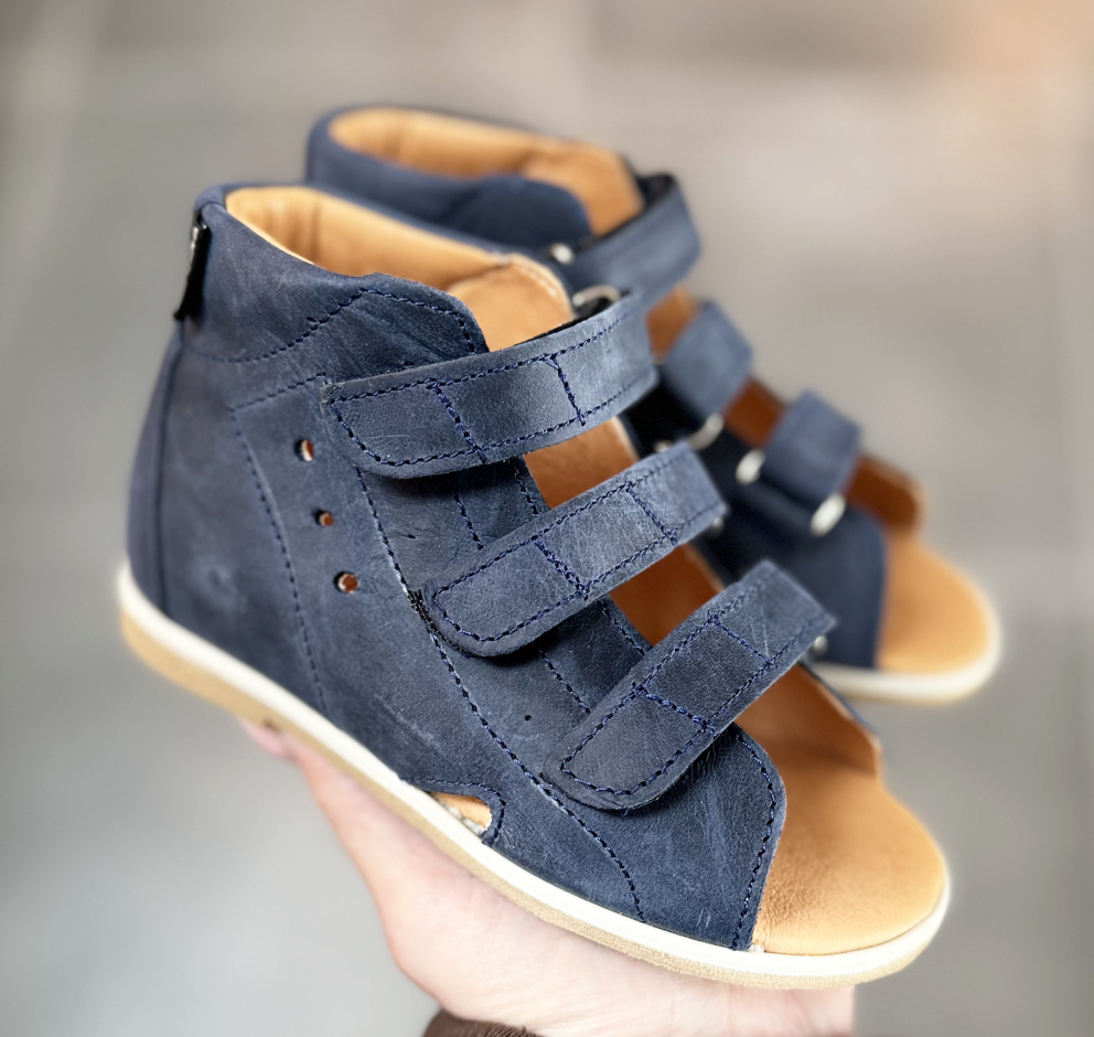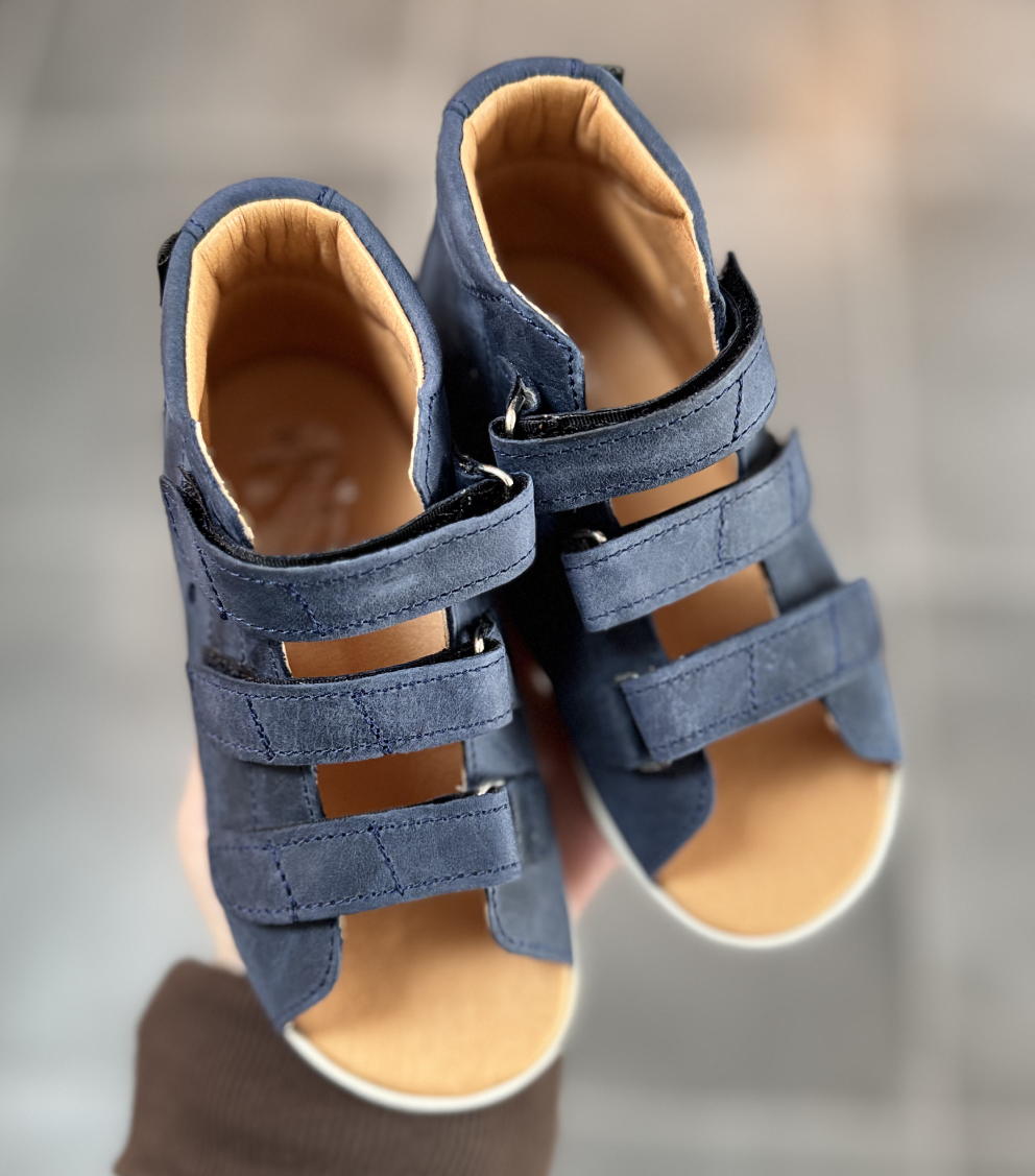 Aurelka sandal i lækker navy nubuck skind. Aurelkas sko er lavet i samarbejde med professionelle, ortopædiske læger og fysioterapeuter for ekstraordinær god støtte til børn med særlige støttebehov.