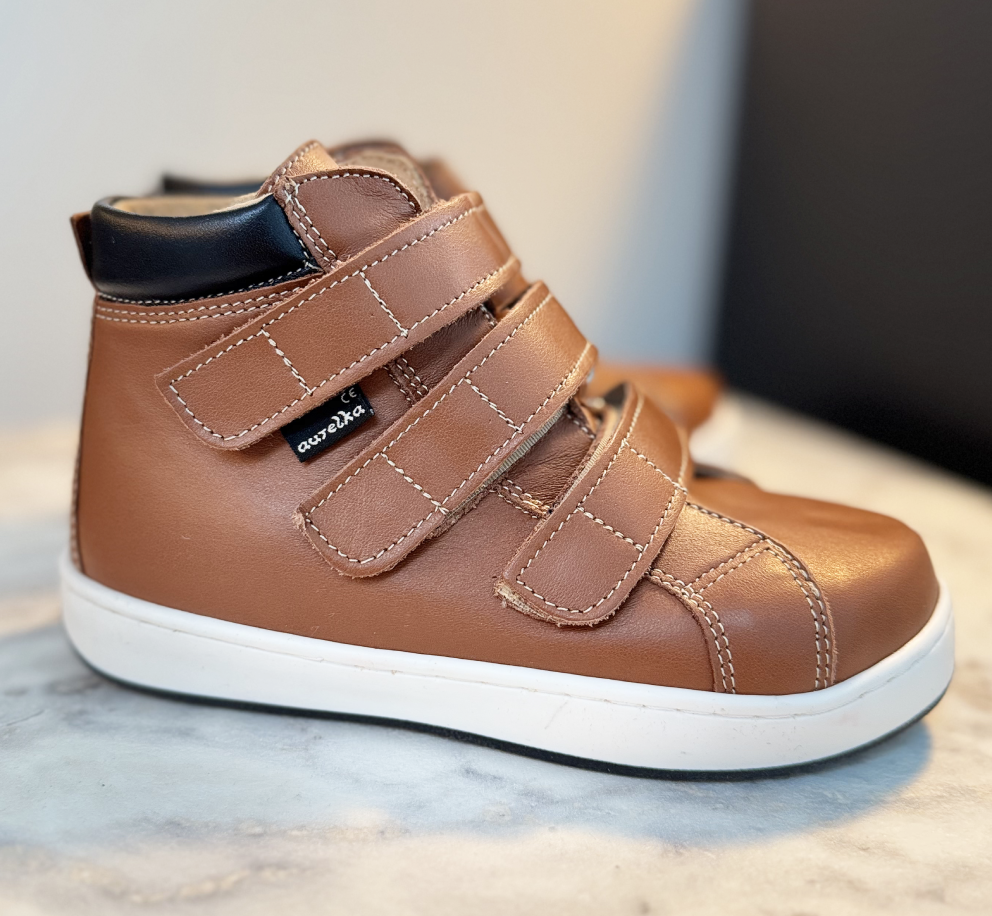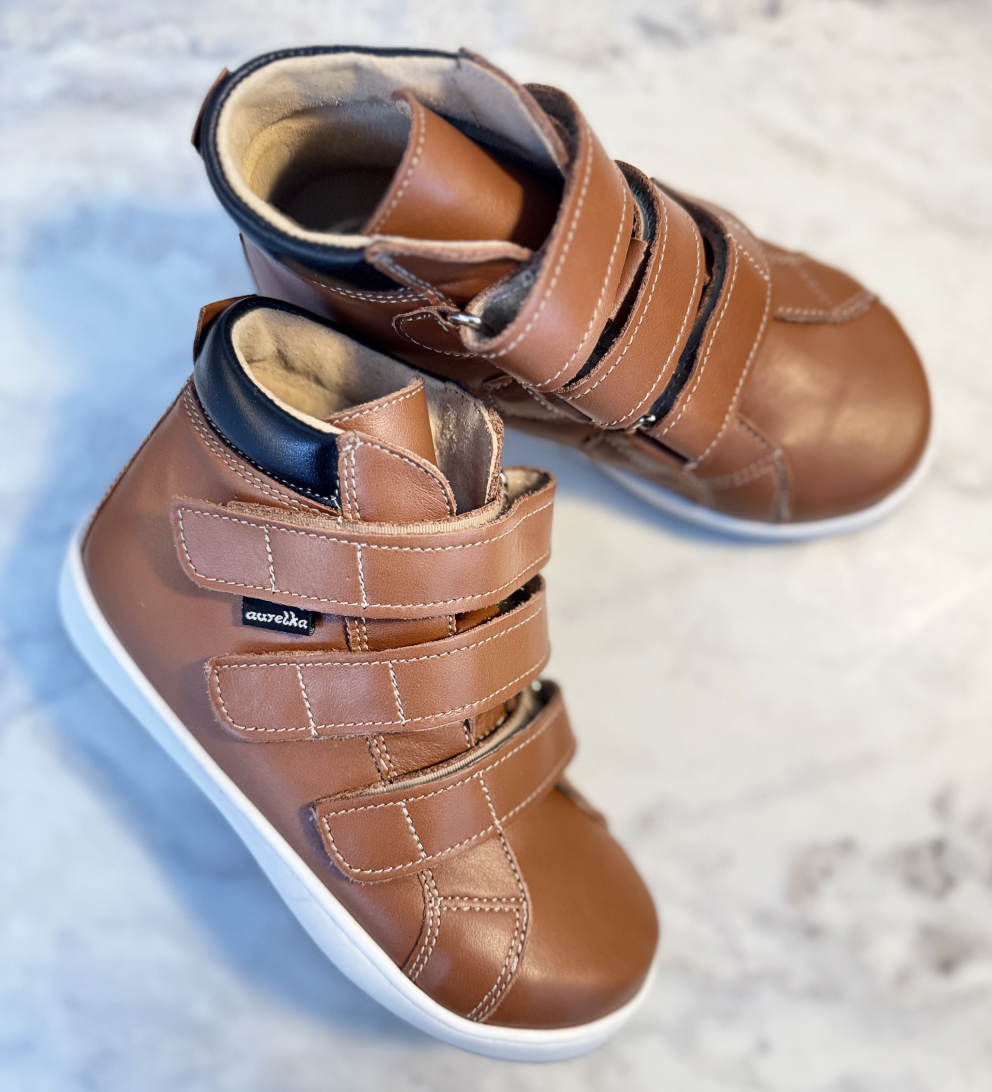 Aurelka velcrosko i caramel/black (cognac farvet) skind. Aurelkas sko er lavet i samarbejde med professionelle, ortopædiske læger og fysioterapeuter for ekstraordinær god støtte til børn med særlige støttebehov.