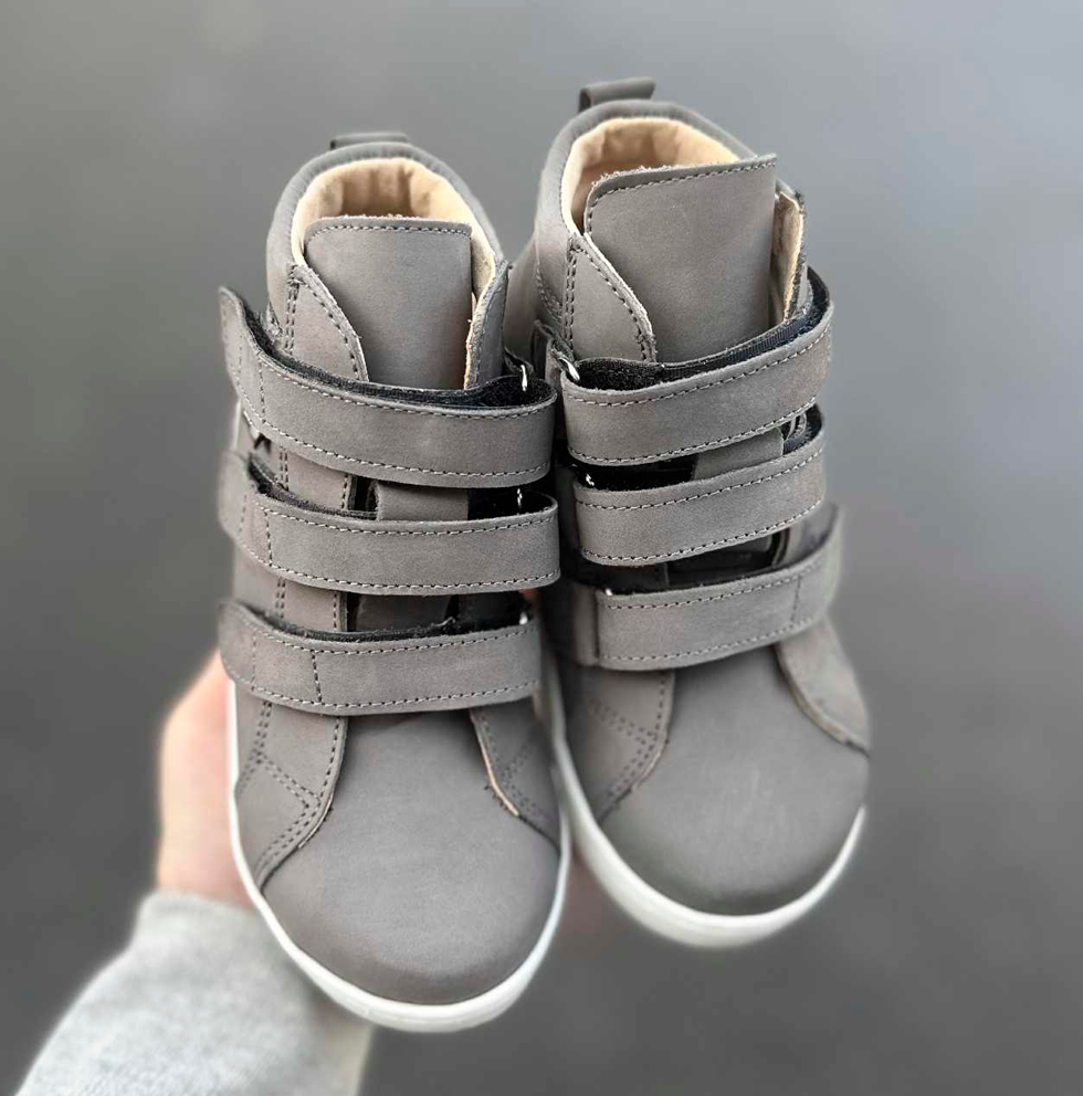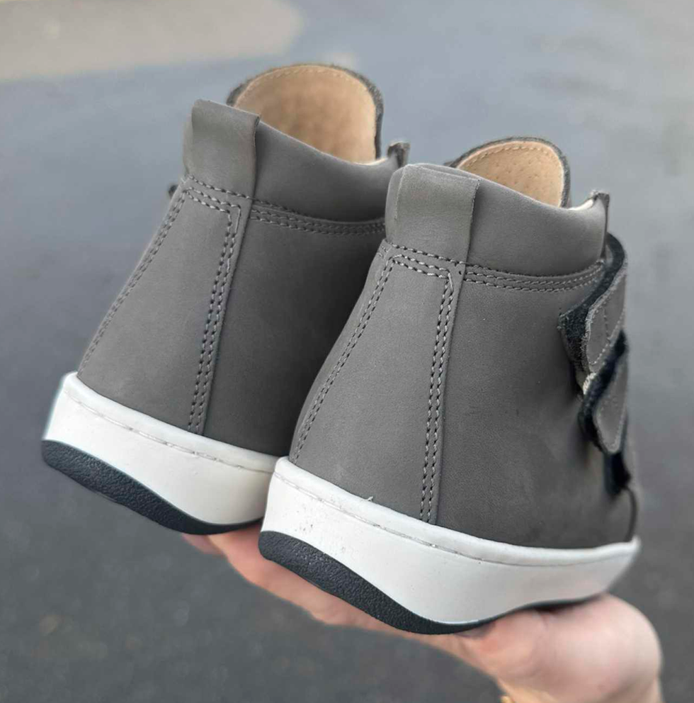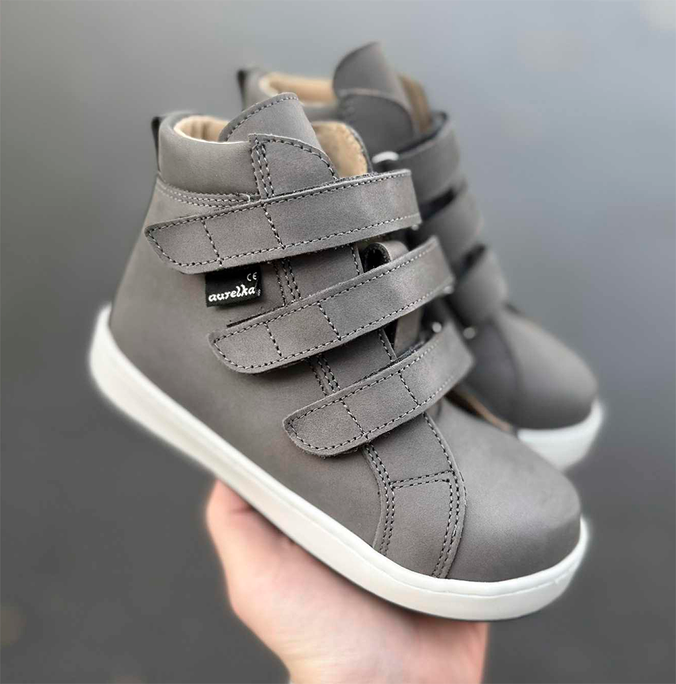 Aurelka velcrosko i grå nubuck skind. Aurelkas sko er lavet i samarbejde med professionelle, ortopædiske læger og fysioterapeuter for ekstraordinær god støtte til børn med særlige støttebehov.