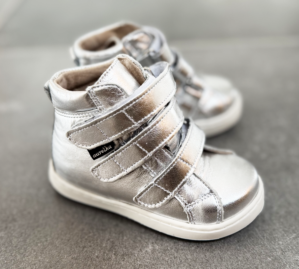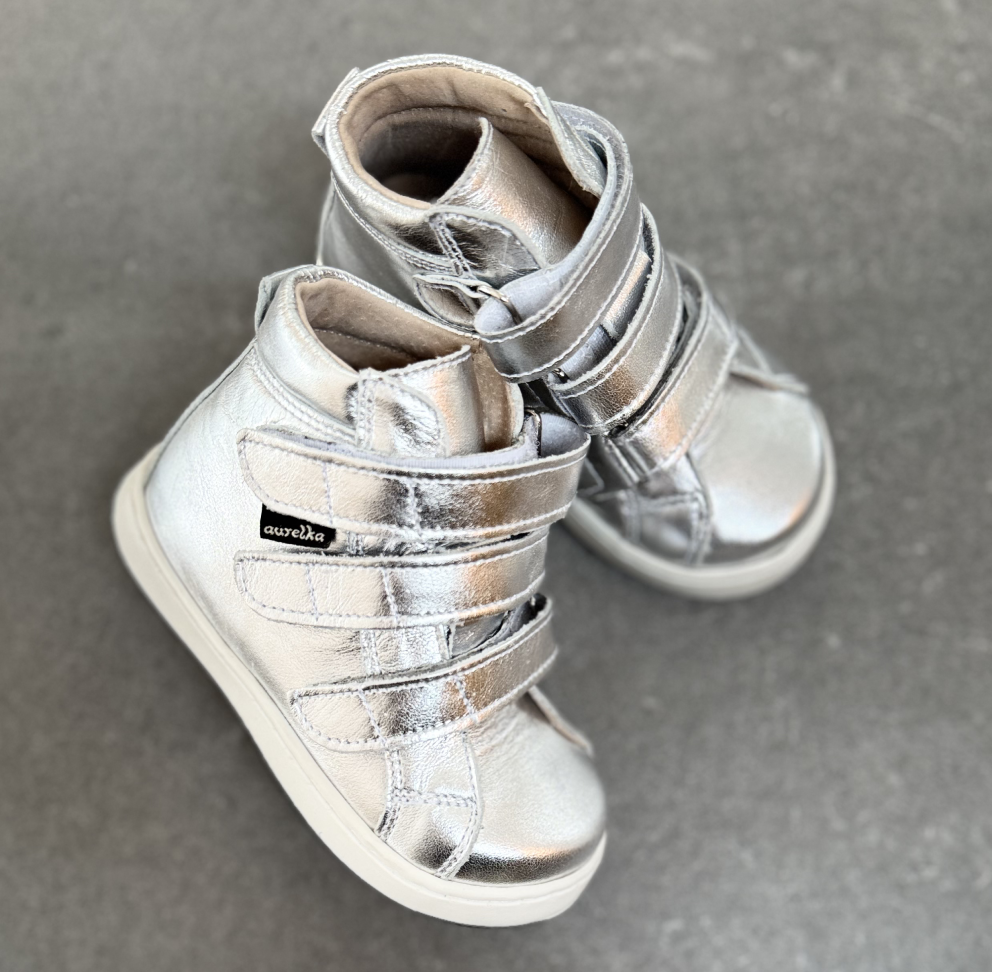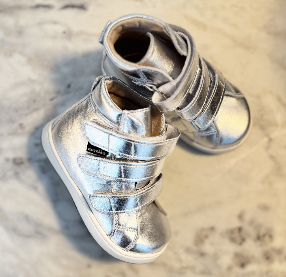Aurelka velcrosko i sølvfarvet skind. Aurelkas sko er lavet i samarbejde med professionelle, ortopædiske læger og fysioterapeuter for ekstraordinær god støtte til børn med særlige støttebehov.
