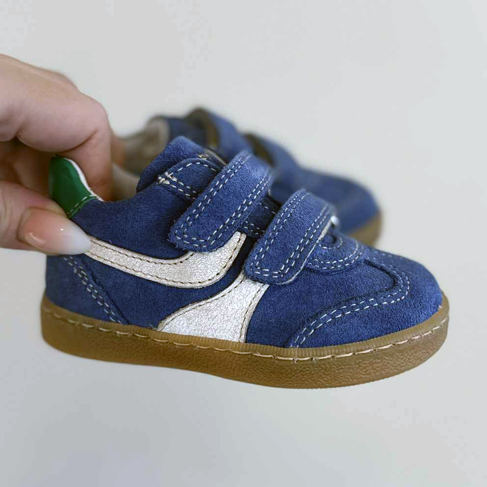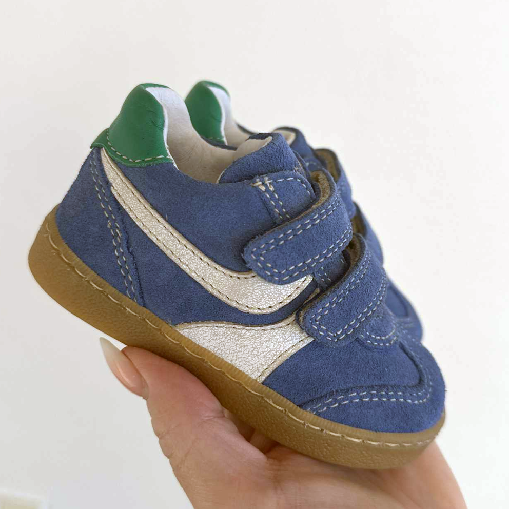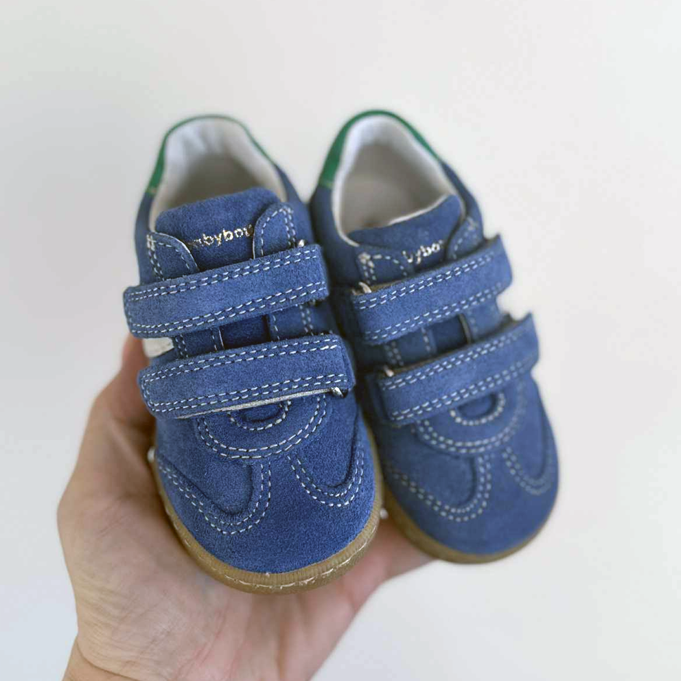 Seje Babybotte sneakers med velcro. Skoene er lavet i blåt ruskind med sporty detaljer. Modellen er lidt højere end almindelig sneakers, men ikke så høj som nogle af vores basketstøvle-modeller. Skoen giver god støtte og stabilitet omkring hæl og ankel - derudover er der let løft til svangen og en god fleksibel gummisål samt udtagelig sål.