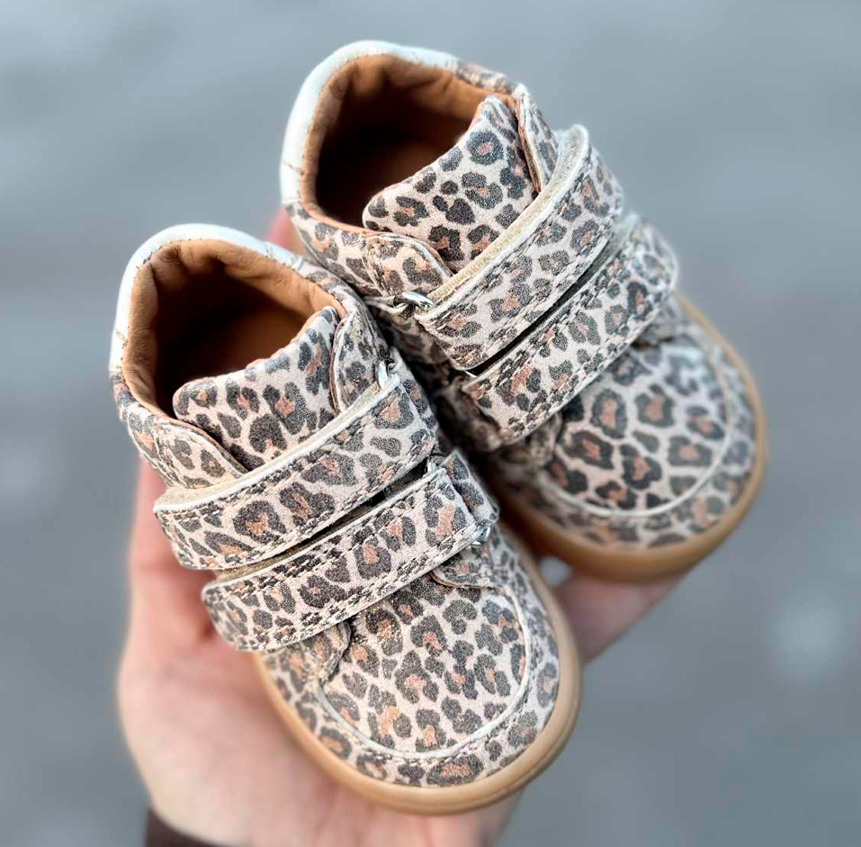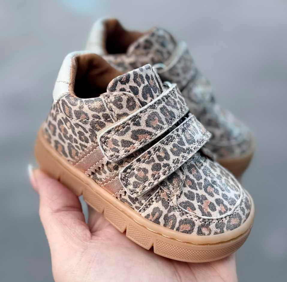 Skønne Babybotte velcrosko / sneakers. Skoene er lavet i skind med en printet overflade i leopard med sporty retro detaljer i rosegold/hvid. Denne model er let og lavere i skaftet end flere andre modeller - men giver stadig god stabilitet omkring hælen. Derudover er der let løft til svangen. God gummisål og udtagelig indersål.
