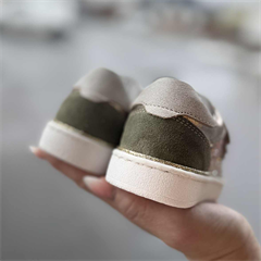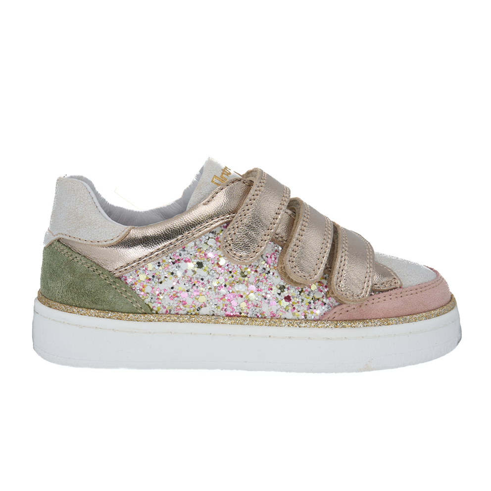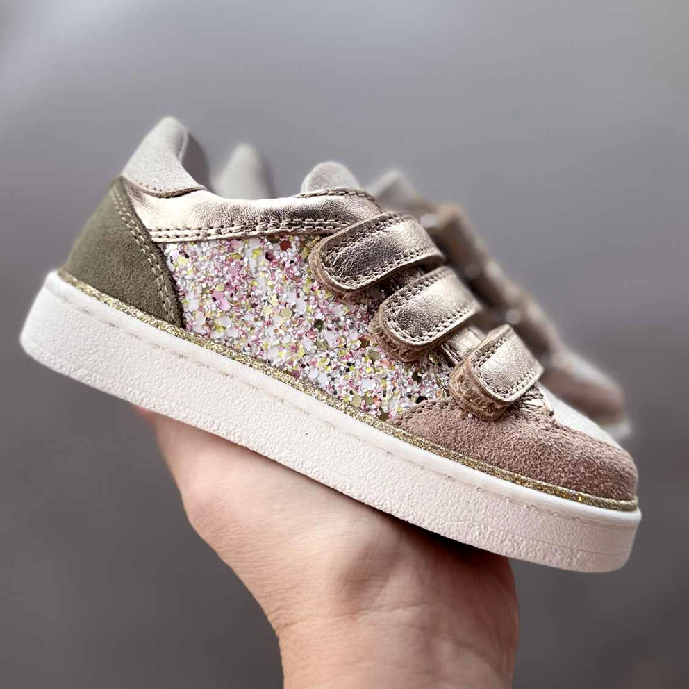 Skønne Babybotte sneakers med tre velcroremme. Skoene er lavet i skind samt ruskind i sart rosa/nude og kaki med flotte detaljer i guld og glimmer. Modellen er lidt lavere end andre af vores modeller, men slutter godt til foden. Modellen giver god støtte og stabilitet - derudover er der let løft til svangen. Skoene har en kraftig gummisål samt udtagelig indersål.