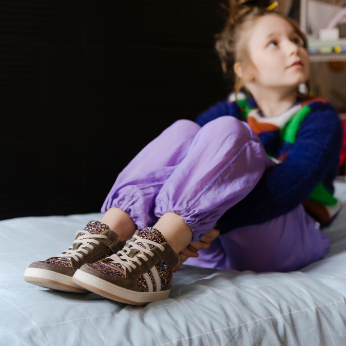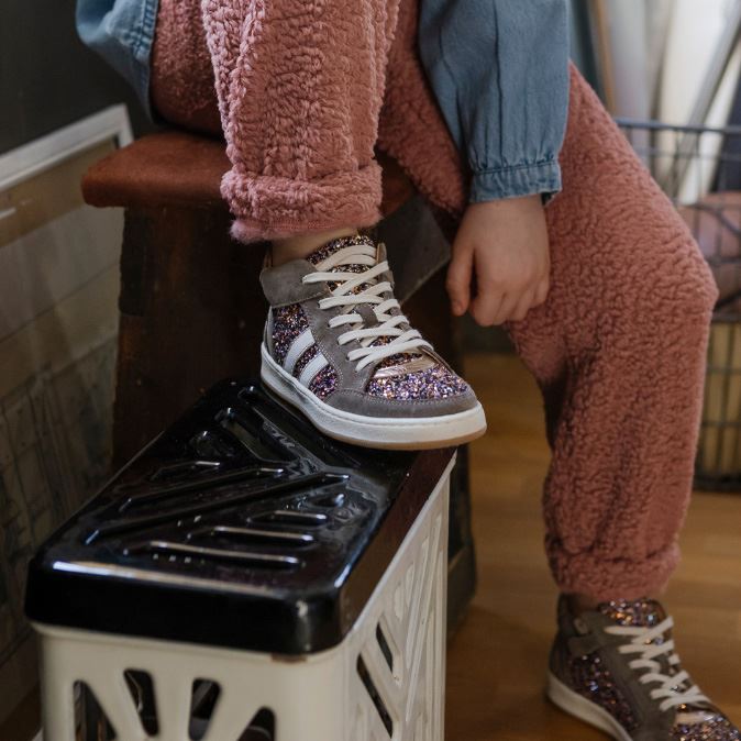 Seje Babybotte snøresko med lynlås på indersiden. Skoene er lavet i mørk sandfarvet ruskind med glimmer og sporty detaljer. Der er en god højde, som giver god støtte og stabilitet omkring hæl og ankel - derudover er der let løft til svangen. God gummisål og udtageligg indersål.