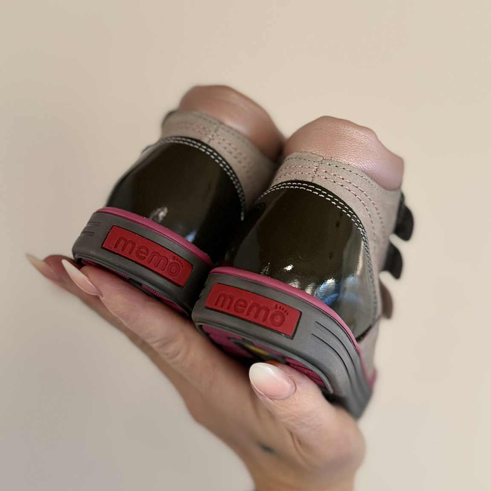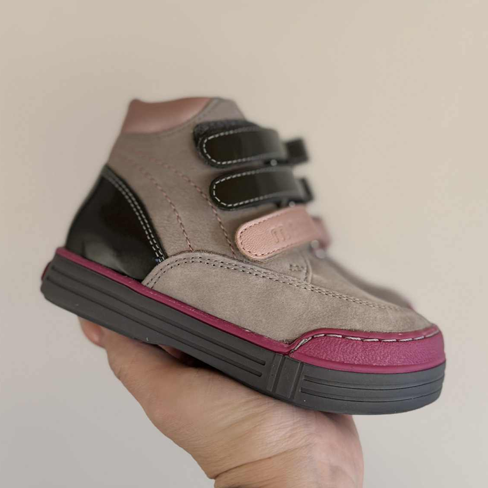 Fine Memo pigesko med velcro. Skoene er i lys grå skind med rosa detaljer samt lak remmene. Skoene har ekstra højde på skaftet for god støtte samt forstærket hælkappe, der støtter indersiden af foden utrolig godt. De tre velcroremme giver en rigtig god tilpasning til foden.